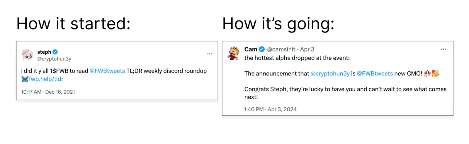 Jon Wu recently wrote a viral thread arguing against early stage companies hiring CMOs. He’s right – early stage founders shouldn’t hire CMOs or Heads of Marketing. FWB is not an early stage company anymore, and FWB didn’t hire a CMO. They hired me, a very online storyteller with niche internet interests and a knack for memes and metrics.