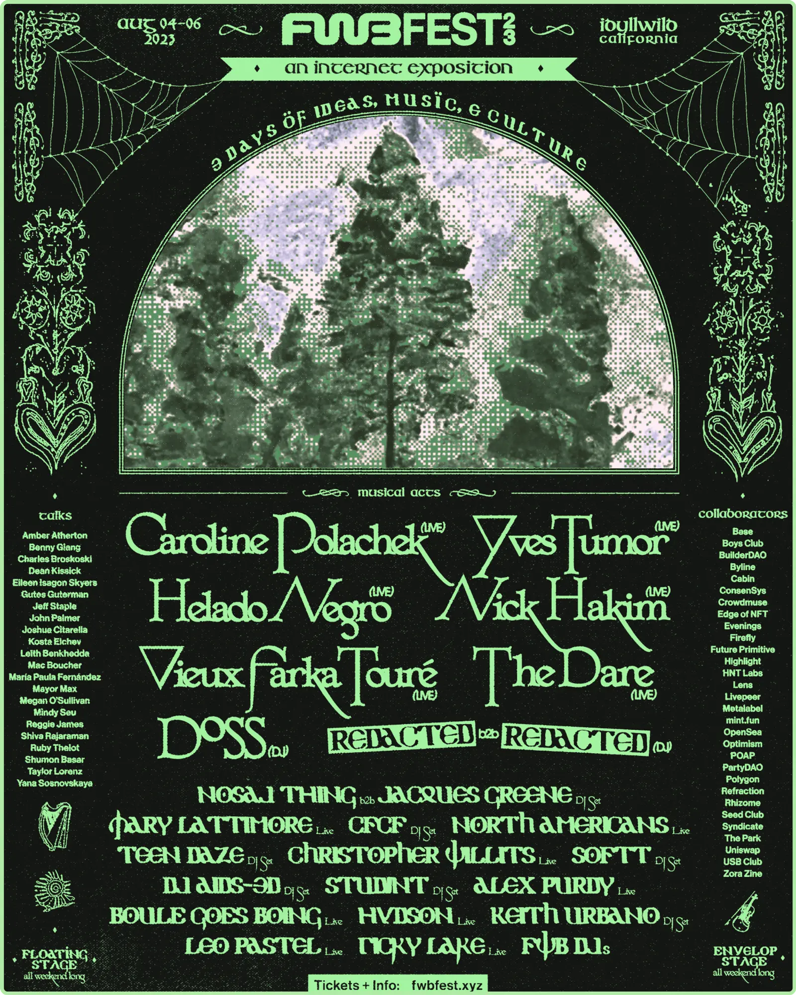 In a matter of days, practically the entire web3 space will descend upon the forested mountain town of Idyllwild, CA to come together for FWB FEST. From renowned platforms like OpenSea and Base, to DAOs like Boys Club, Refraction, and PartyDAO, to collectives like Metalabel and cultural organizations like Rhizome, this year’s FEST partner and collaborator lineup reads like a veritable who’s-who of the new internet.