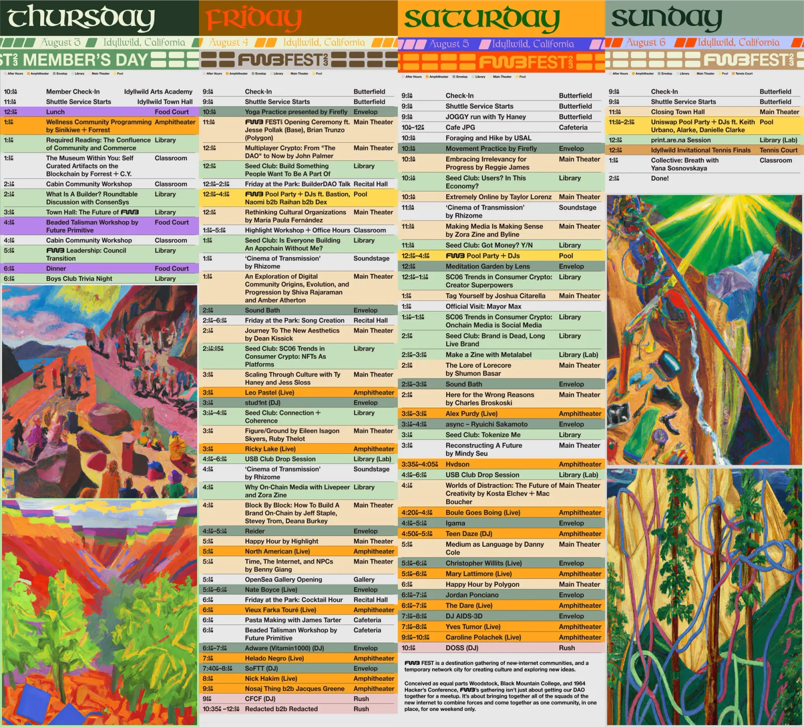Although we’d love for every member of our internet collective to join us in-person, we know getting to Idyllwild isn’t a possibility for everyone. That’s why we’re thankful that Base and mint.fun is sponsoring live-streamed sessions throughout the weekend. Stay tuned to @FWBtweets for info on live-streamed sessions.