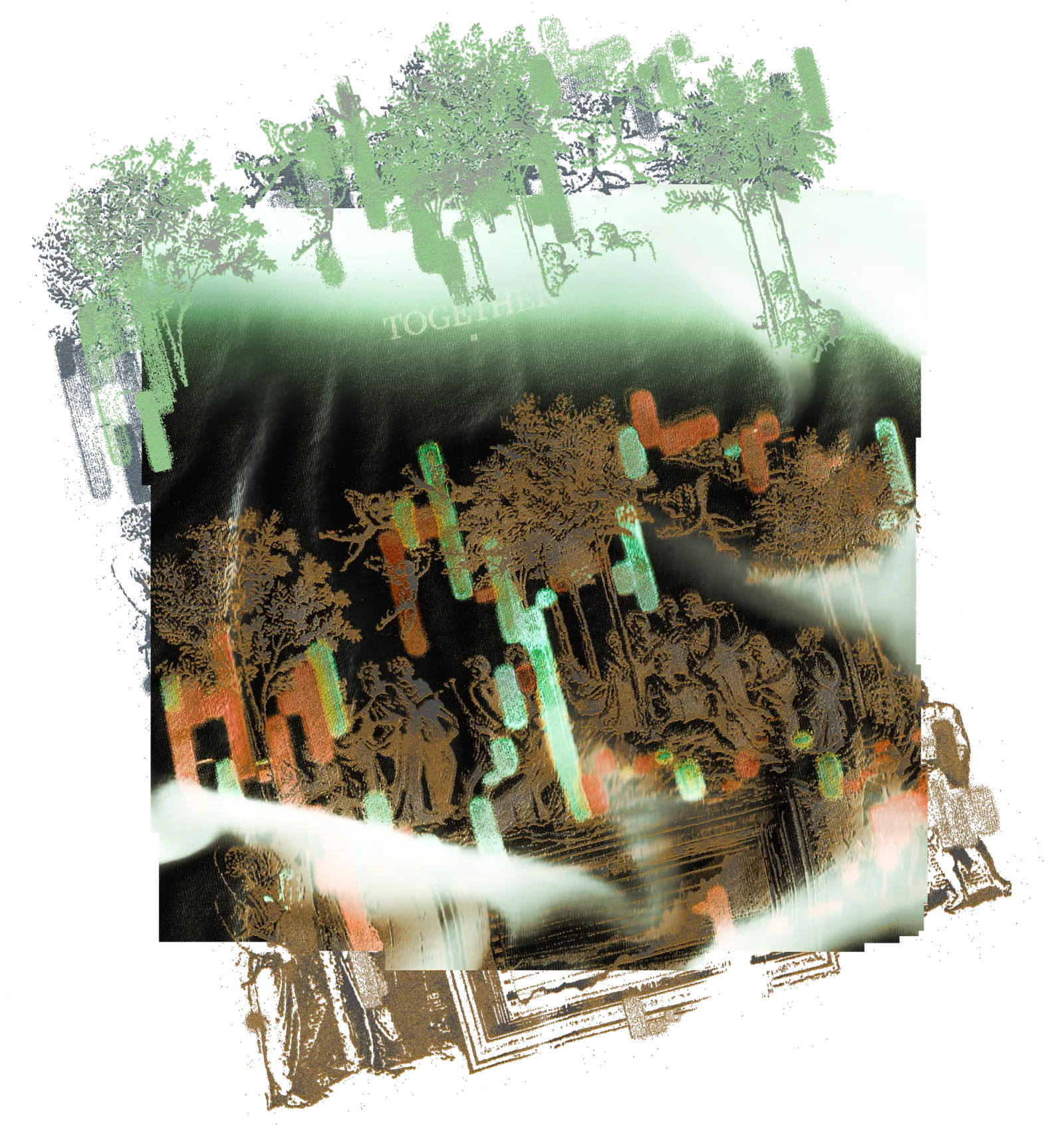 With its embroidered serif fonts and rich colors, the Together collection looks like it could belong in a bin of psych-rock band tees. What makes the project unique is its attempt to democratize the production process, along with its tongue-in-cheek references to digital life. One graphic references a week in March 2021 when the value of the $FWB token plummeted and more than 800 ETH was drained from the DAO’s liquidity pool after the social token issuer Roll was hacked. Even though the token value fell by more than 90 percent, people stayed. In homage to that collective commitment, the designers remix a 16th-century Raphaelite engraving of Apollo on Parnassus, surrounded by mortal poets and musicians, to include $FWB’s price chart graph; a Creative Commons musing on artist collectives stretching through time. You can buy it on a hoodie or a long-sleeve T, and down the road, likely as an NFT.
