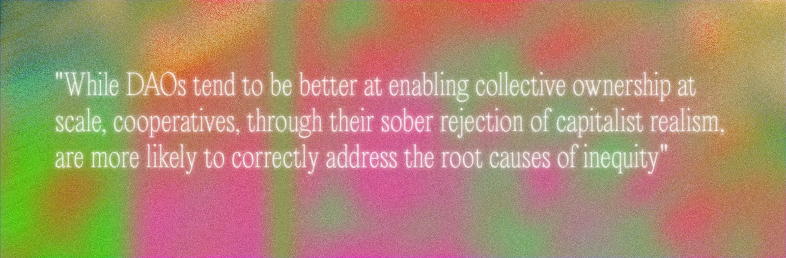 From my experiences in the two spaces, I have noticed that DAOs tend to be better at enabling collective ownership at scale, even if their cultural understanding of the rights, responsibilities, and accountability associated with ownership is comparatively underdeveloped. And while cooperatives tend to be less successful in securing funding, they are also more likely, through their sober rejection of capitalist realism, to correctly address the root causes of inequity. Below, I’ll share some of the key takeaways I have gleaned about what DAOs and co-ops can learn from each other.