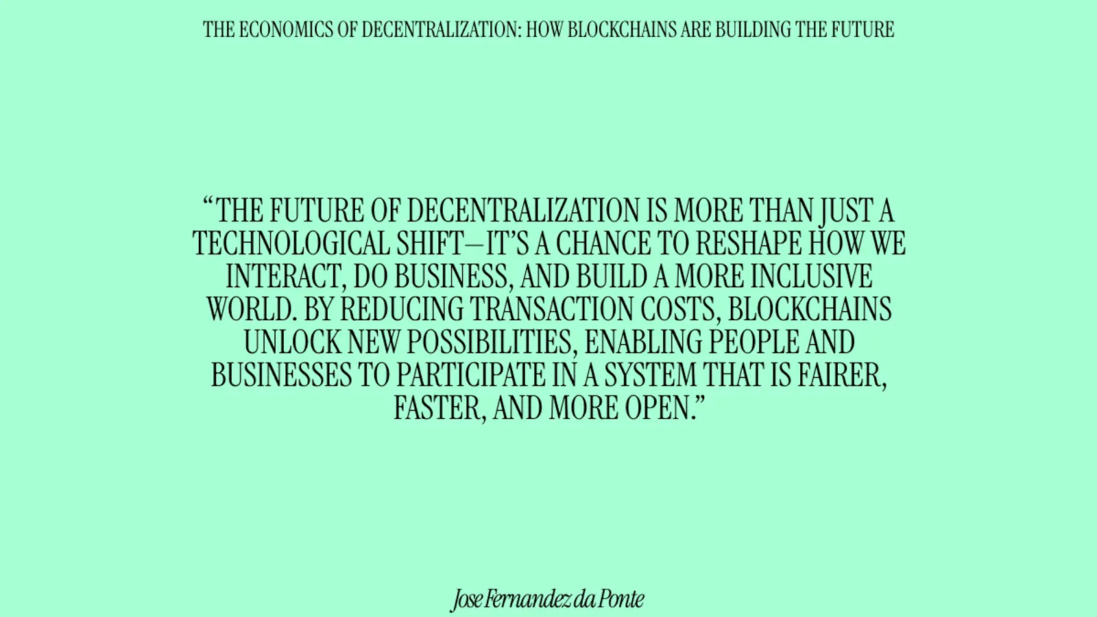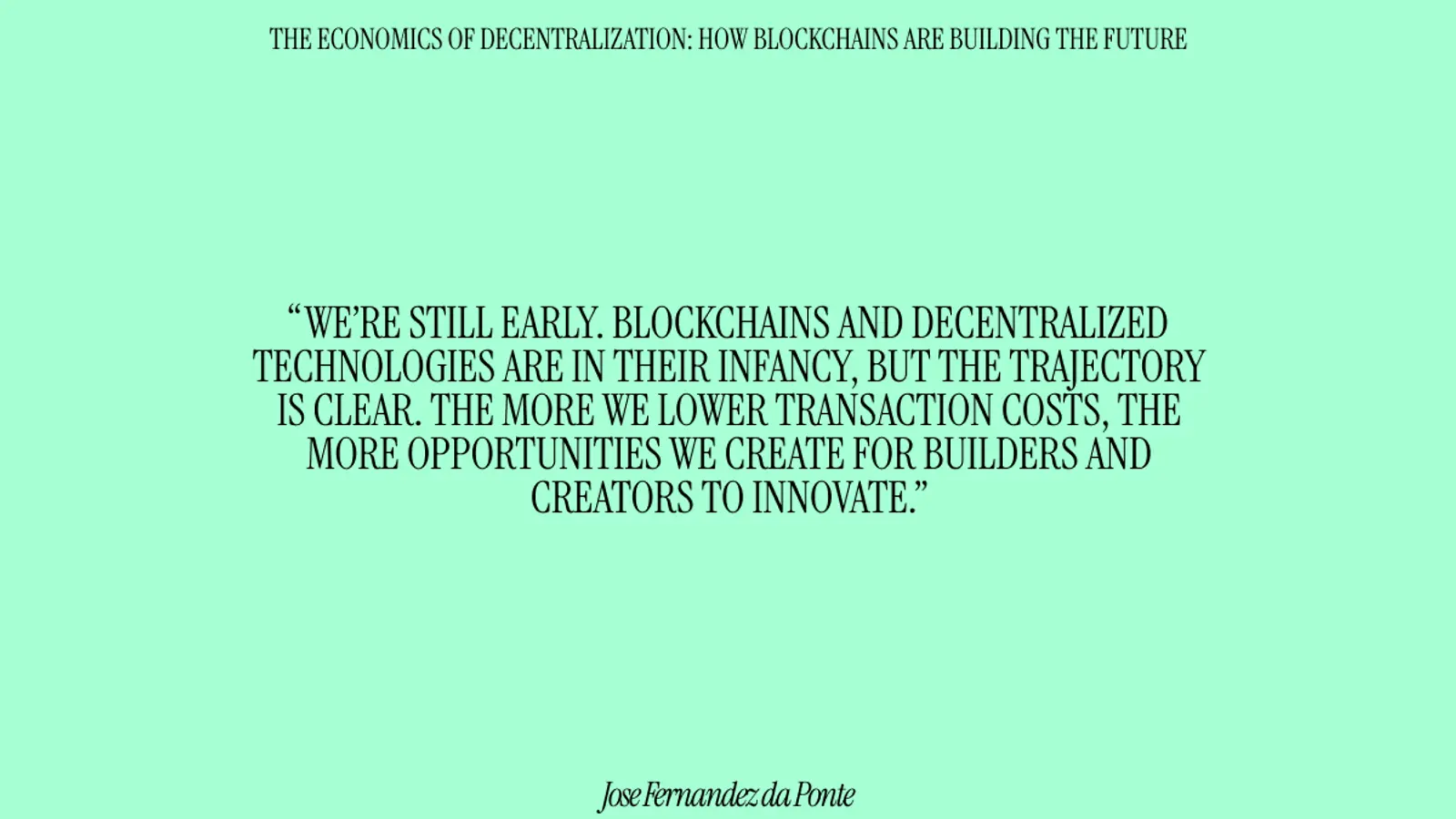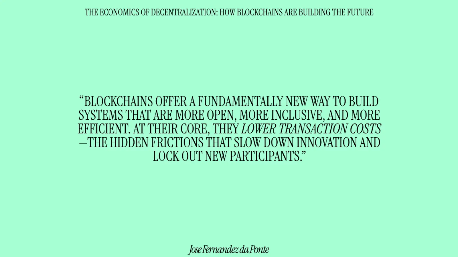 Decentralization flips that script, when a system can run at lower transaction costs without concentrating power. When systems are open and permissionless, anyone can build on top of them, just like developers did with the early internet. That’s where blockchains come in—they enable a new wave of innovation by removing the need for central gatekeepers and allowing people to interact directly, securely, and at scale at a fraction of the cost.